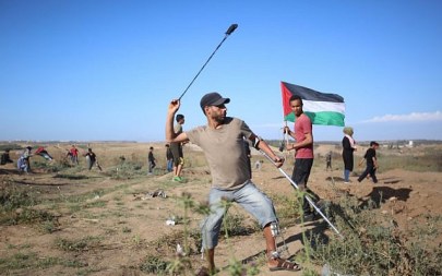 Palestinianss clash with Israeli troops during protests at the Israel-Gaza border, on May 3, 2019 (Hassan Jedi/Flash90)
