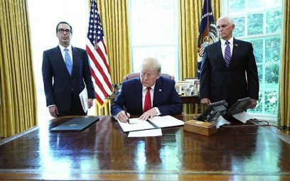 US President Donald Trump signs with US Vice President Mike Pence(R) and US Secretary of Treasury Steven Mnuchin at the White House on June 24, 2019, ‘hard-hitting sanctions’ on Iran’s supreme leader. (MANDEL NGAN / AFP)
