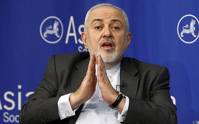 Iran’s Foreign Minister Mohammad Javad Zarif speaks at the Asia Society in New York, on April 24, 2019. (AP Photo/Richard Drew)