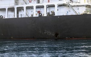 This image released by the U.S. Department of Defense on Monday, June 17, 2019, is a view of hull penetration/blast damage on the starboard side of the motor vessel M/T Kokuka Courageous, which the Navy says was sustained from a limpet mine attack while operating in the Gulf of Oman, on June 13th. (U.S. Department of Defense via AP)