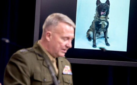 The dog, a male whose name has not been released because the mission was classified, was injured when he came in contact with exposed live electrical cables in the tunnel after al-Baghdadi detonated his vest, McKenzie said. He said the dog has returned to duty.