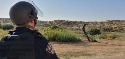 A police officer looks at a rocket fired from the Gaza Strip that struck outside a parking lot in the city of Ashdod on November 12, 2019. (Israel Police)