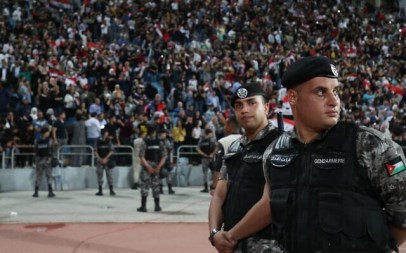 Jordanian police stand guard during the FIFA World Cup 2022 and the 2023 AFC Asian Cup qualifying soccer match between Iraq and Iran in the Jordanian capital Amman on November 14, 2019. (Khalil MAZRAAWI/AFP)