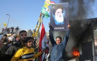 An Iraqi supporter of the Hashed al-Shaabi military network lifts a picture of Iraq’s top Shiite cleric Grand Ayatollah Ali Sistani during a rally in front of the US embassy in the capital Baghdad, on December 31, 2019, to vent anger over weekend air strikes that killed pro-Iran fighters in western Iraq. (Photo by AHMAD AL-RUBAYE / AFP)