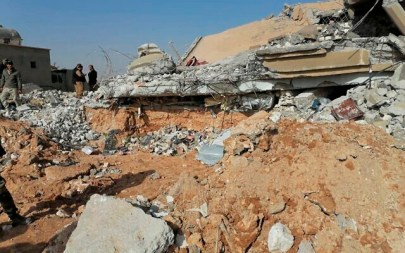 Fighters from the Kataeb Hezbollah, or Hezbollah Brigades militia, inspect the destruction of their headquarters in the aftermath of a US airstrike in Qaim, Iraq, December 30, 2019. (AP Photo