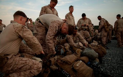 In this photo provided by U.S. Department of Defense, U.S. Marines assigned to Special Purpose Marine Air-Ground Task Force-Crisis Response-Central Command (SPMAGTF-CR-CC) 19.2, prepare to deploy from Kuwait in support of a crisis response mission, Tuesday, Dec. 31, 2019. (U.S. Marine Corps photos by Sgt. Robert G. Gavaldon via AP)
