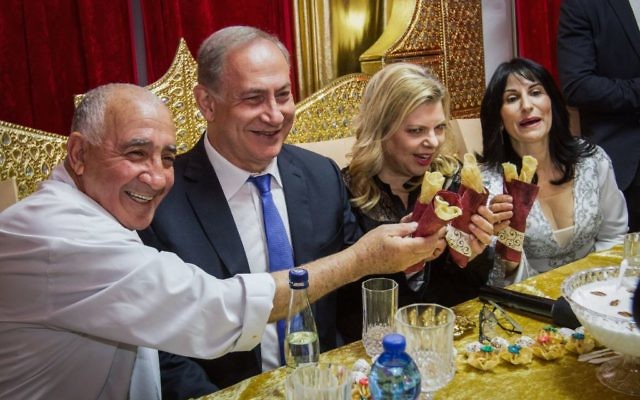 Prime Minister Benjamin Netanyahu and his wife Sara attend the Jewish Moroccan celebration of Mimouna, in Hadera on April 17, 2017. (Ido Erez/POOL)