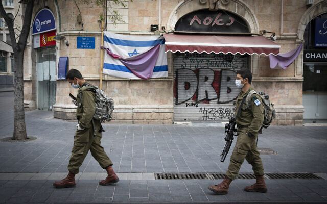 Soldiers patrol in downtown Jerusalem to enforce the Passover curfew, April 09, 2020. (Olivier Fitoussi/Flash90)