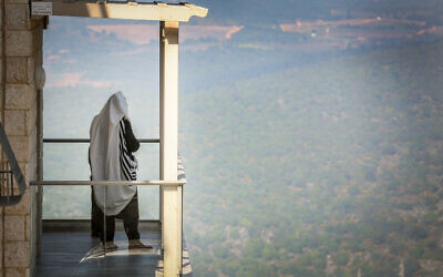 A man prays on a balcony in the northern city of Safed on April 13, 2020. (David Cohen/Flash90)