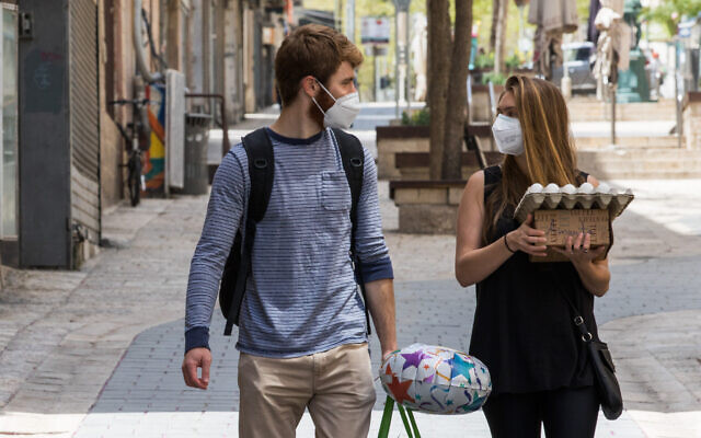 A Israelis wearing face masks walk with eggs on Ben Yehuda Street in Jerusalem on April 16, 2020. (Olivier Fitoussi/Flash90)