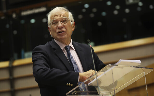 In an implied rebuke of Arab countries warming their ties with Israel — including the UAE and Bahrain, which last week signed the Abraham Accords at the White House — he said Iran “never made a deal over the Holy Quds and the fundamental rights of the Palestinian people.”French President Emmanuel Macron at the Elysee Palace in Paris, September 21, 2020. (Michel Euler/AP)
