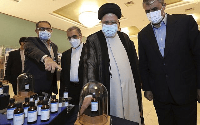 In this photo released by the official website of the office of the Iranian Presidency, President Ebrahim Raisi, second right, receives an explanation while visiting an exhibition of Iran’s nuclear achievements in Tehran, Iran, on Saturday, April 9, 2022. (Iranian Presidency Office via AP)