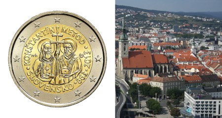 The European Commission ordered Slovakia to redesign its commemorative coins by eliminating the Christian Saints Cyril and Methonius. (Image sources: Coin – European Commission; Bratislava, Slovakia – Frettie/Wikimedia Commons)