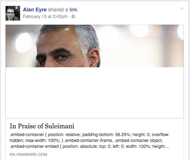 In one Feb. 13 posting, when Iran talks were at a critical stage, Eyre disseminated a link to an article praising Iranian Quds Force Chief Ghassem Suleimani, who is directly responsible for the deaths of Americans abroad.