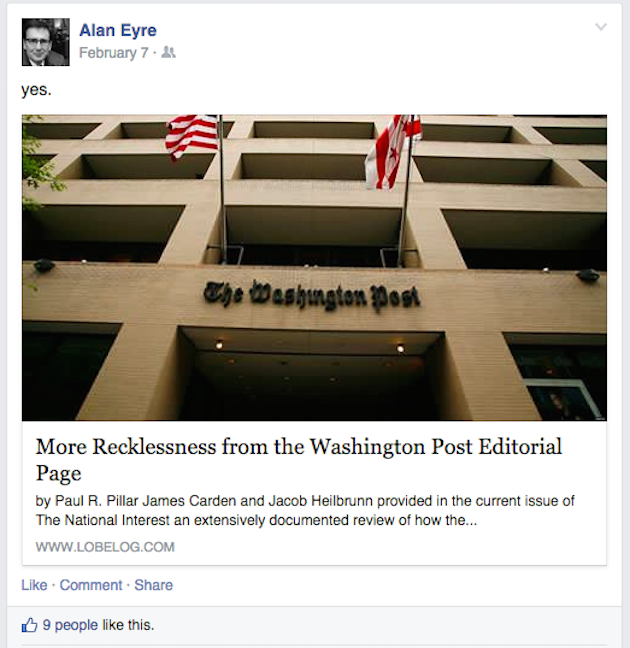 In another posting from Feb. 5, Eyre links to the website LobeBlog, which is viewed by critics as anti-Israel and regularly attacks neoconservative pundits.”