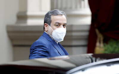 Political deputy at the Ministry of Foreign Affairs of Iran, Abbas Araghchi, enters the ‘Grand Hotel Wien’ where closed-door nuclear talks take place in Vienna, Austria, May 19, 2021. (AP Photo/Lisa Leutner)