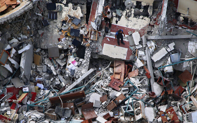 Palestinians inspect the destroyed building housing the offices of The Associated Press and other media after it was hit last week by an Israeli airstrike, in Gaza City, Friday, May 21, 2021. Israel says the building housed Hamas offices. (AP Photo/Hatem Moussa)