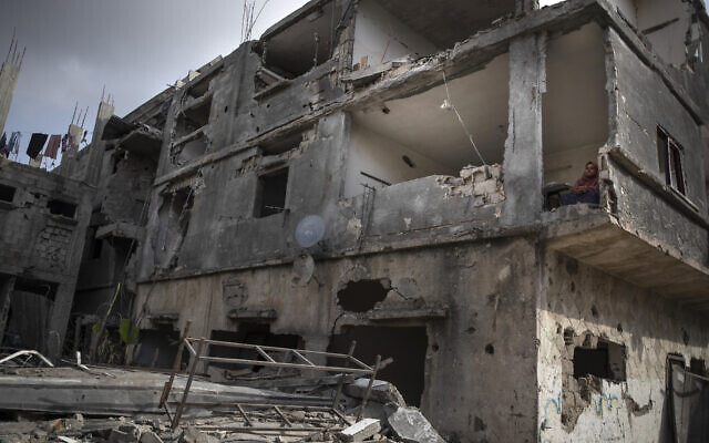 A Palestinian woman sits inside the second floor of her destroyed house following a cease-fire reached after an 11-day war between Gaza’s Hamas rulers and Israel, in town of Beit Hanoun, northern Gaza Strip, Friday, May 21, 2021. (AP Photo/Khalil Hamra)