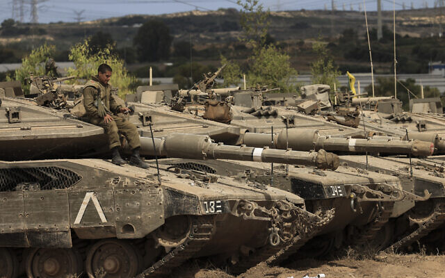 An Israeli soldier sits on top of a tank at a staging ground near the border with Gaza Strip, southern Israel, Friday, May 21, 2021. A cease-fire took effect early Friday after 11 days of heavy fighting between Israel and Hamas. (AP Photo/Tsafrir Abayov)