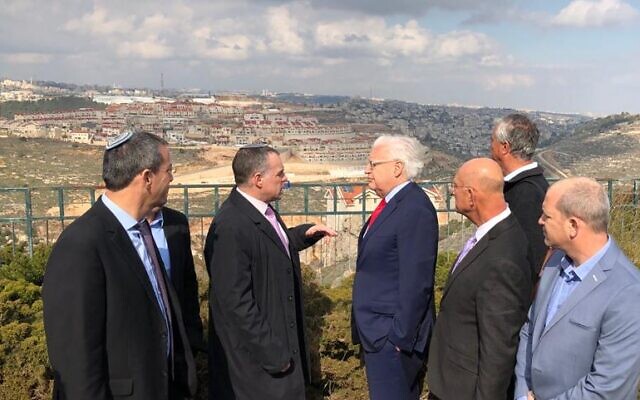 US Ambassador to Israel David Friedman (4th from right) tours the Efrat settlement with settler leaders on February 20, 2020. (Courtesy)