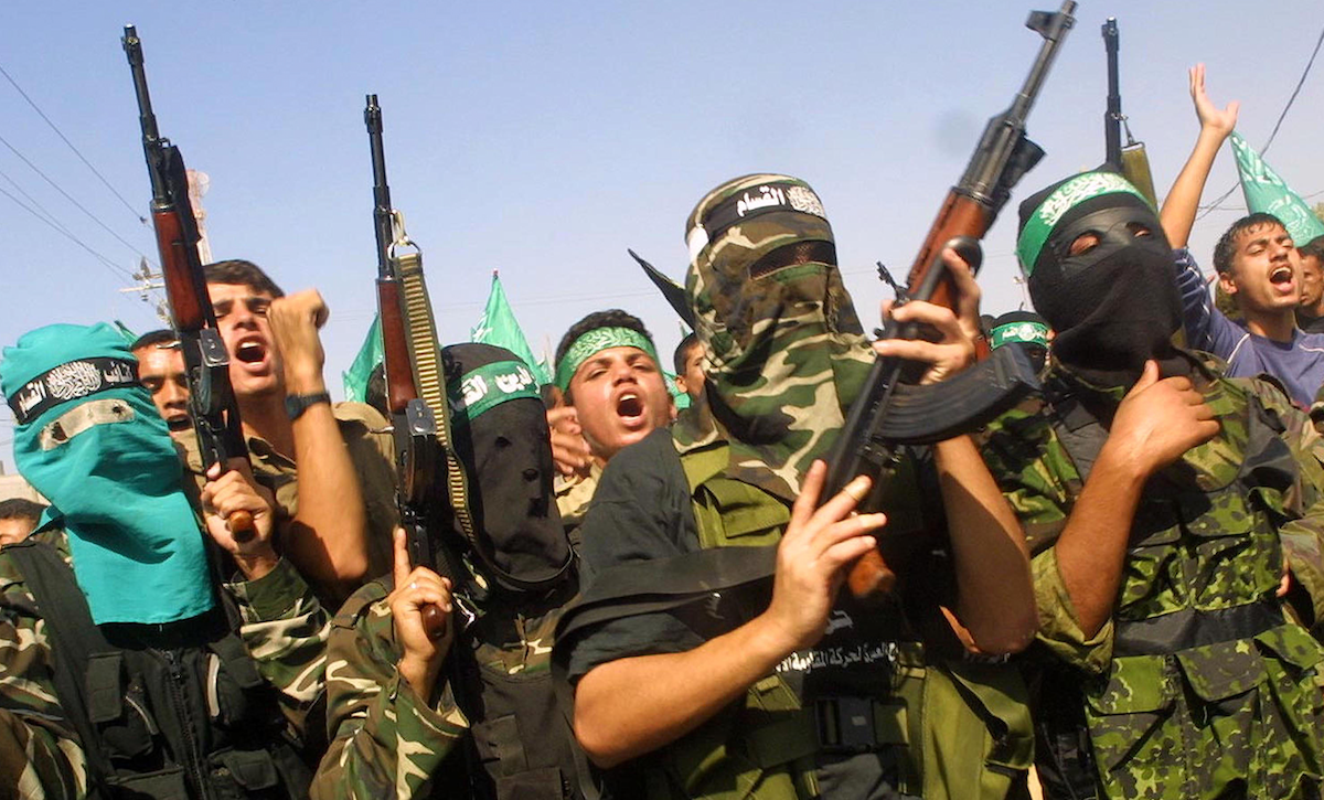 RAFAH REFUGEE CAMP, GAZA STRIP – OCTOBER 18: Masked Palestinian Hamas militants attend the funeral of Tariq Abu Hussein, senior Gaza field commander of the Ezzedin al-Qassam Brigades, the armed wing of the radical Hamas movement October 18, 2003 at the Rafah refugee camp in the southern Gaza Strip. Medics state that Israeli forces killed Abu Hussein, another Islamic militant and a female bystander in fighting at the Palestinian refugee camp.