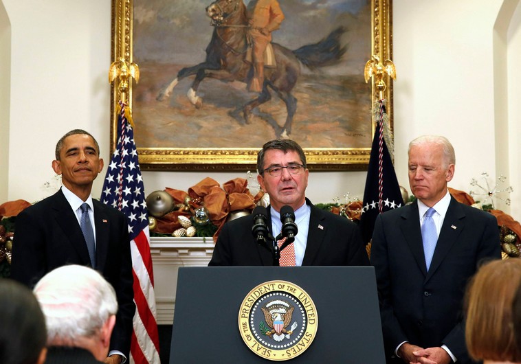 Ashton Carter (C), US President Barack Obama (L) and US Vice President Joseph Biden (R).. (photo credit:REUTERS)