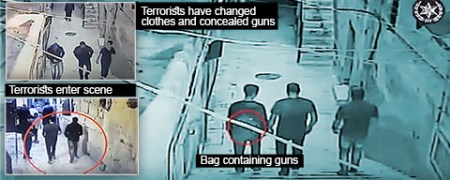 The film shows not three but four men who carefully stepped away from each other before entering the Al Aqsa Mosque. There, the three gunmen were handed their weapons by the fourth confederate, who made his escape among the crowds of worshippers exiting the mosque.