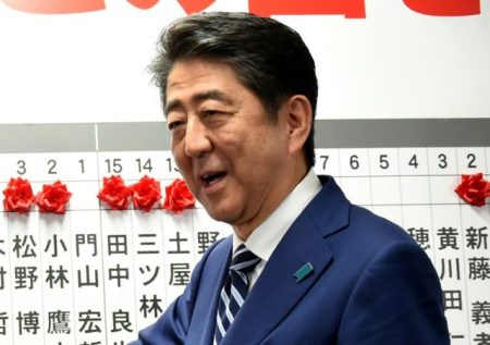 Tokyo (AFP) – Japanese Prime Minister Shinzo Abe swept to a resounding victory in a snap election Sunday and immediately vowed to “deal firmly” with threats from North Korea that dominated the campaign.