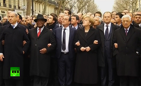 World leaders link arms at the Paris anti-terror rally on January 11, 2014. Palestinian Authority President Mahmoud Abbas stands at the far right of the front row. (Image source: RT video screenshot)