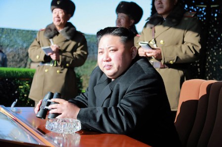 This undated photo released by North Korea’s official Korean Central News Agency (KCNA) on December 11, 2016 shows North Korean leader Kim Jong-Un (C) during a combat drill of the service personnel of the special operation battalion of the Korean People’s Army Unit 525. (Photo credit KNS/AFP/Getty Images)