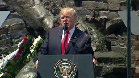 President Donald Trump gives a speech in Warsaw, Poland, in front of the monument commemorating the 1944 Warsaw Uprising against the Germans, on July 6, 2017. (Image source: The White House)